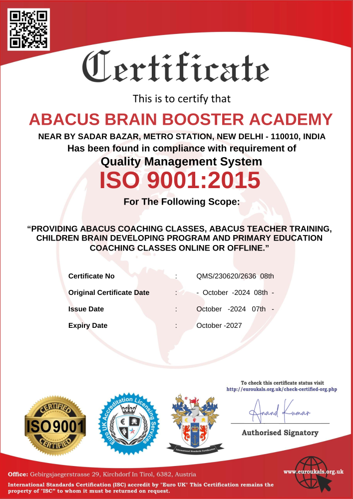At Abacus Brain Booster Academy, we specialize in Abacus and Mental Math Training to enhance children's brain development, concentration, memory, problem-solving skills, and mathematical abilities. Our ISO, ISC, and MSME Certified Abacus Academy is designed to help kids excel in academics and competitive exams through scientific brain exercises.